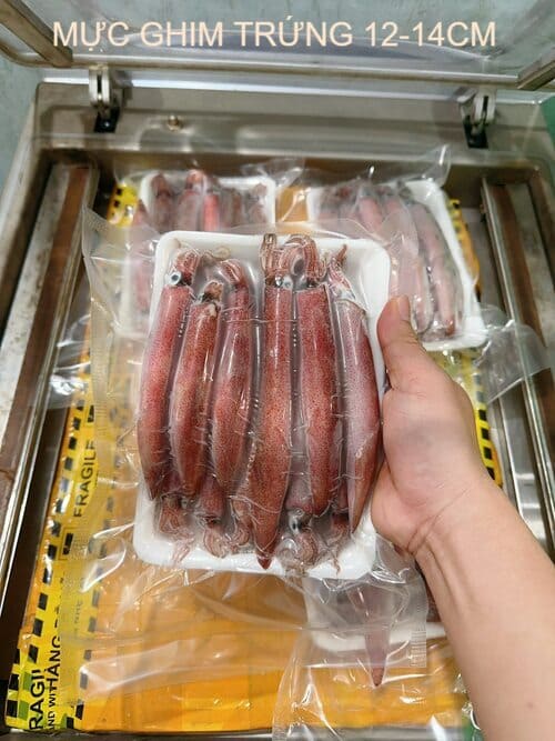 Mực ghim trứng size 12–14cm là dòng mực ghim kích thước lớn, thân mực dài, dày thịt và phần trứng rõ, nhiều. Đây là phân khúc mực ghim cao cấp, thường được lựa chọn cho các món ăn yêu cầu hình thức đẹp, khẩu phần lớn và giá trị thương mại cao.