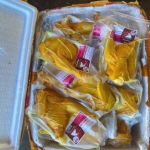 Gà ủ muối được cung cấp theo hai dạng chính: nguyên con và nửa con. Mỗi dạng đều được đóng khay riêng, sau đó gom thùng 20kg, thuận tiện cho nhập kho và phân phối.